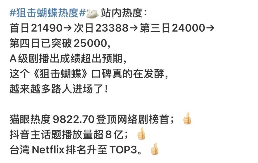一是《狙击蝴蝶》虽然播的晚,但目前讨论度和话题度看着要比《大生意人》高出不少的: