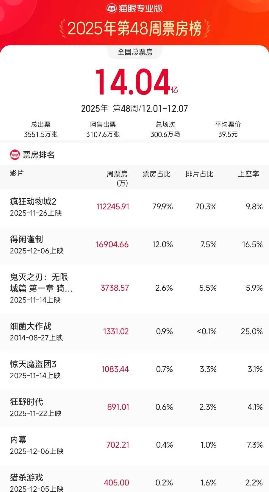据猫眼专业版数据,12.01-12.07中国内地一周票房报收14.04亿,虽较前一周的21.11亿下跌33.5%,但相比《疯狂动物城2》上映前的冷淡,影市热度仍处于高位。