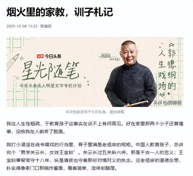 郭德纲并没有针对约谈或者整改发那个标准公关通稿,而是轻描淡写地发出了一篇长文——《烟火里的家教,训子札记》。