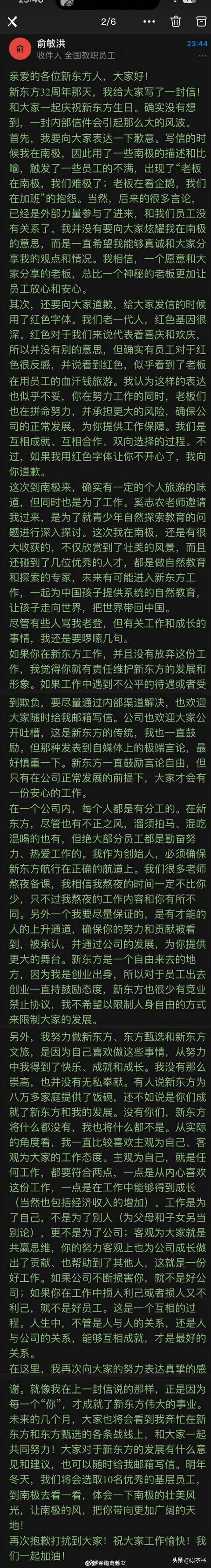 那时身处地球最南端的俞敏洪,给全体员工发了一封内部信,标题叫做“冰雪中的坚守”,字里行间充满了对大家的感谢和对公司未来的展望。
