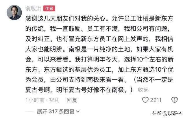 另一方面,他立马拿出了实际行动:宣布将在明年冬天,邀请10名基层优秀员工和10名东方甄选的优秀会员,由公司全额支持,一同前往南极进行考察。