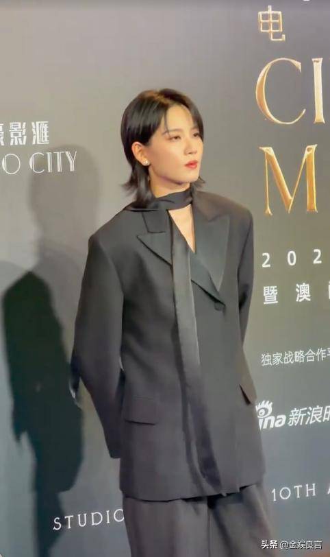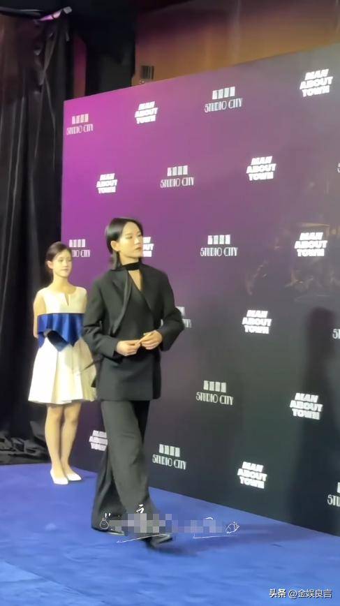 她走红毯时步子迈得很小,双手紧紧攥着西装下摆,像是怕衣服滑落。