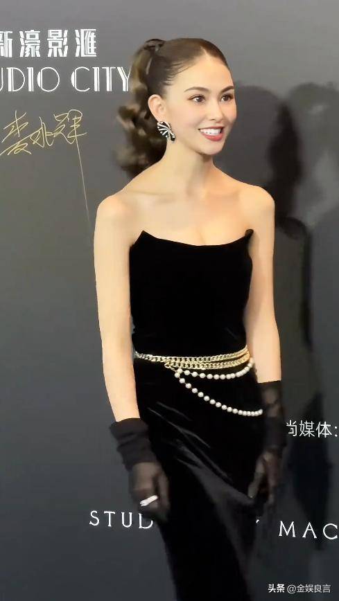 裙子剪裁贴合身形,完美勾勒出修长的身材曲线,她戴着黑色手套,每一步都走得优雅从容。