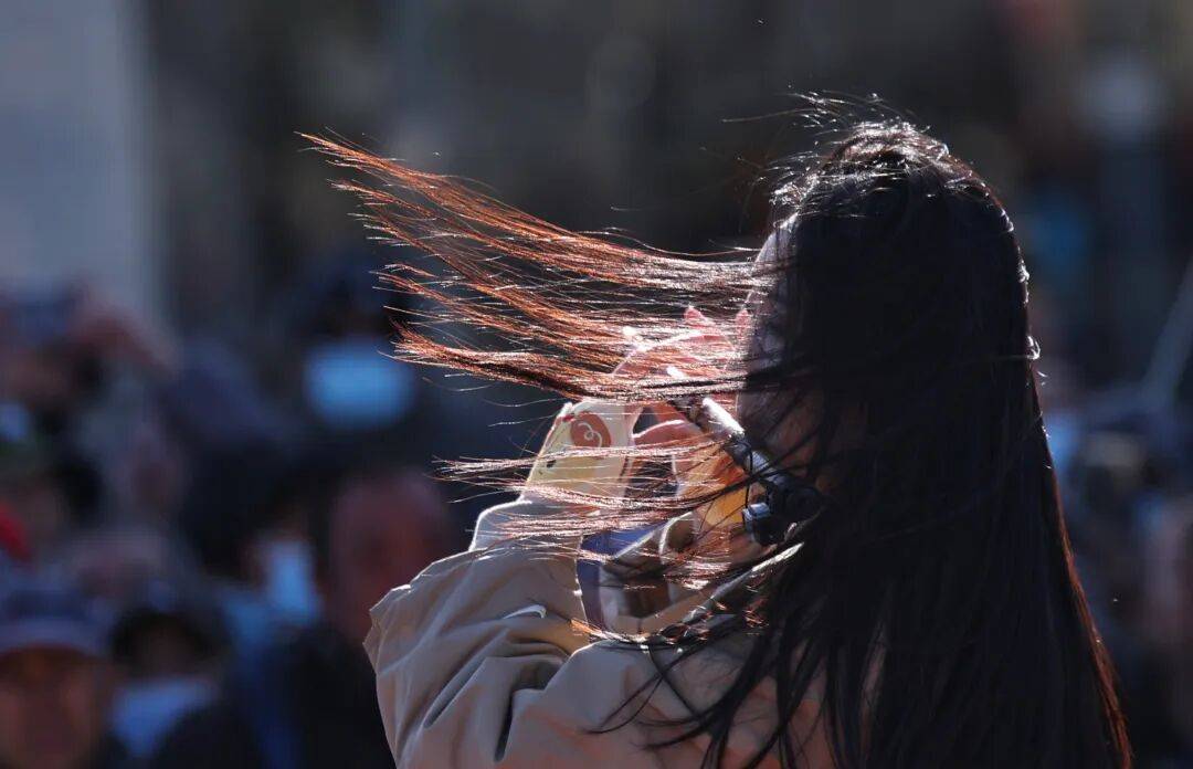 2025年12月7日,天桥市民广场,孙楚泊在大风中演奏。她的头发随风而起,笛声也飘向远方。
