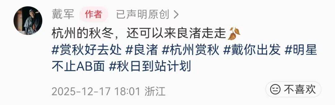 继打卡杭州九溪、茅家埠之后,12月17日,知名艺人戴军在个人社交平台晒出在杭州良渚游玩的视频,并配文:杭州的秋冬,还可以来良渚走走。