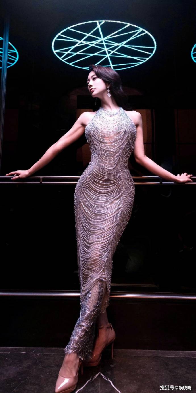 “克拉拉”李成敏一袭银色挂脖连珠长裙,苗条身材一览无余