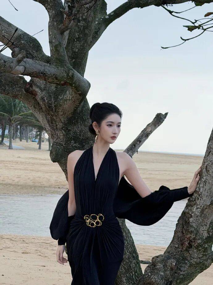 在海边暗调光影下,王玉雯的裙摆随风飘动形成“磅礴叙事感”,被网友形容为“静谧中带着力量感”的暗夜美学。