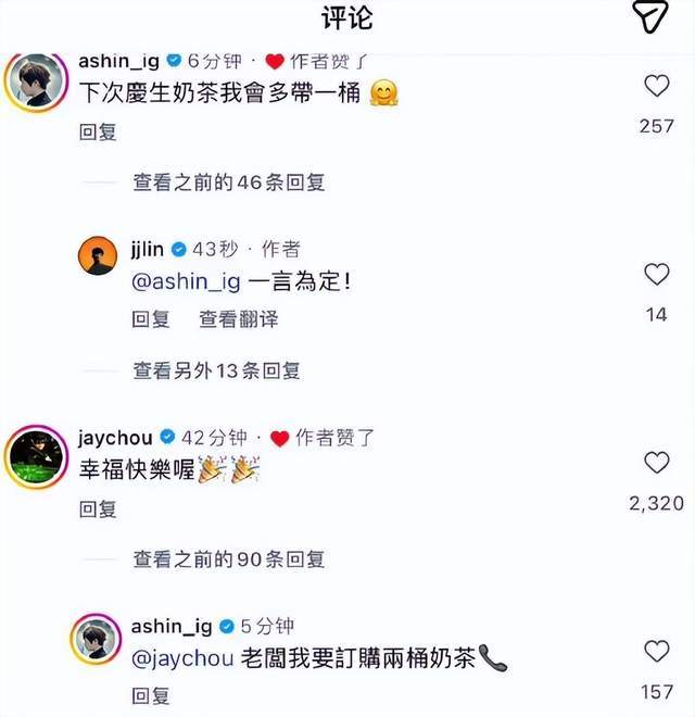 周杰伦、阿信、林志颖这些大牌明星都纷纷送上祝福,一时间,整个娱乐圈都沉浸在一片欢乐祥和的氛围中。阿信更是幽默调侃:“下次庆生奶茶我会多带一桶”,还喊话周杰伦“老板我要订购两桶奶茶”,林俊杰秒回“一言为定”,三人因奶茶爱好被粉丝称为“奶茶三兄弟”,这波操作真的是太有爱了!
