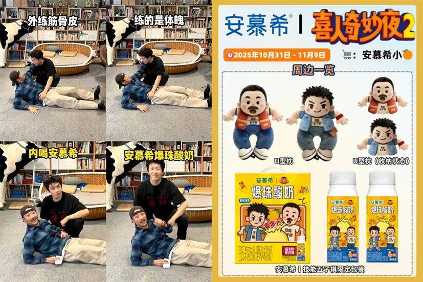 品牌的反应也很快,以安慕希为例,在“技能五子棋”播出后迅速与核心主创张兴朝合作,推出定制短片,并快速推出限定包装产品。