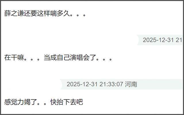 薛之谦也是把江苏卫视当自己演唱会了,唱着唱着就开始递话筒,但这是跨年晚会直播,台下观众的声音录不上啊,在观众听来就是唱着唱着没声了,观感并不是很好。